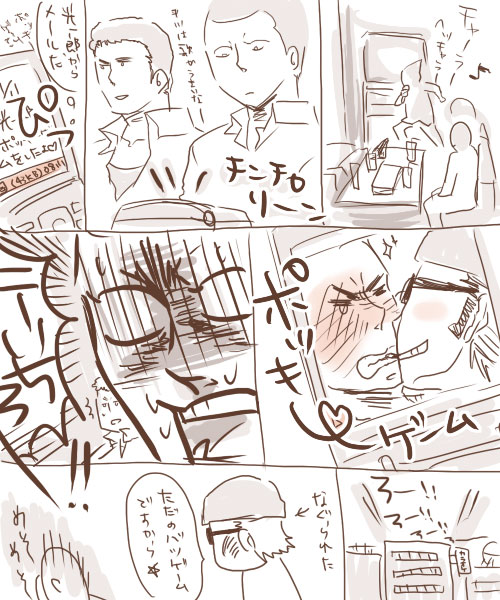 罰ゲームでかっちゃんにこんなメールを送りつけられて凹んでる丹波さんです。ちゅーはしてません。ばっか、丹波さんのプルプル唇はかっちゃんのものだぜ!(病気ですね^^)それよりも、全てメモリーオブ貧脳を頼りに描いたとかひどすぎると思いますよ。