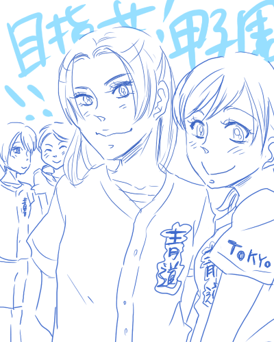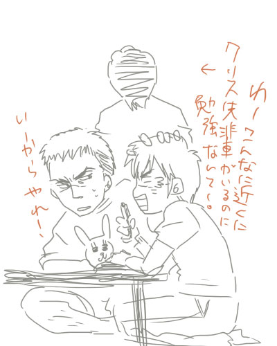 だけれどもマガを弟に取られて感想が思い出せない、ダメなオタク。記憶力が乏しすぎる・・・。とりあえず、金丸→クリスフラグたちました。なんだお前なんだお前、そんなにクリス先輩と仲良しなのか!ばか!可愛い!っていうか、金丸いい人過ぎて大好きだ。なんだかんだで面倒見いいし、優しいよな。ちょっと口は悪いけど、仲間思いの好感度MAXボーイ。こうやって部屋に呼んで勉強教えてあげてるんだろうな~。教室でも、休み時間や昼休みを利用してみっちりしこたま教育してあげてるのが想像できて微笑ましい。金丸+沢村(一年生ズ)も可愛い。っていうか、金丸頭いいのかな。頭がそれなりによくなかったらクリス先輩に頼まれたりしないもんね。頭がよくて面倒見がよくてちょっと口が悪いとか、わー金丸設定どんどん膨らむ笑。あとは、金丸のポジションが知りたいです。外野かファーストくらいに思っているのだけれど・・・どうなんだろう。気になる。今度もっとちゃんとした金丸描くぞ。Tシャツの柄とか考えるの楽しみ~。