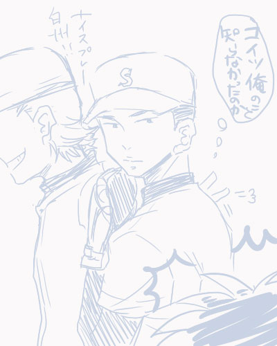 大阪好きです!もっと二人の絡みとかも見てみたかった~。おホモなしに。可愛いぜ!というか、前の号から沢村ちゃんの活躍が!と思っていたのにいきなり大阪戦終わっててビックリしましたよ。何の焦らしプレイか!でも、引っ張り過ぎないで次に期待が高まる感じいいですね。わーテラジマテンテー神!あ、次は春っちにもチャンスを与えてあげてください。仲良し三人組で出してください!